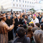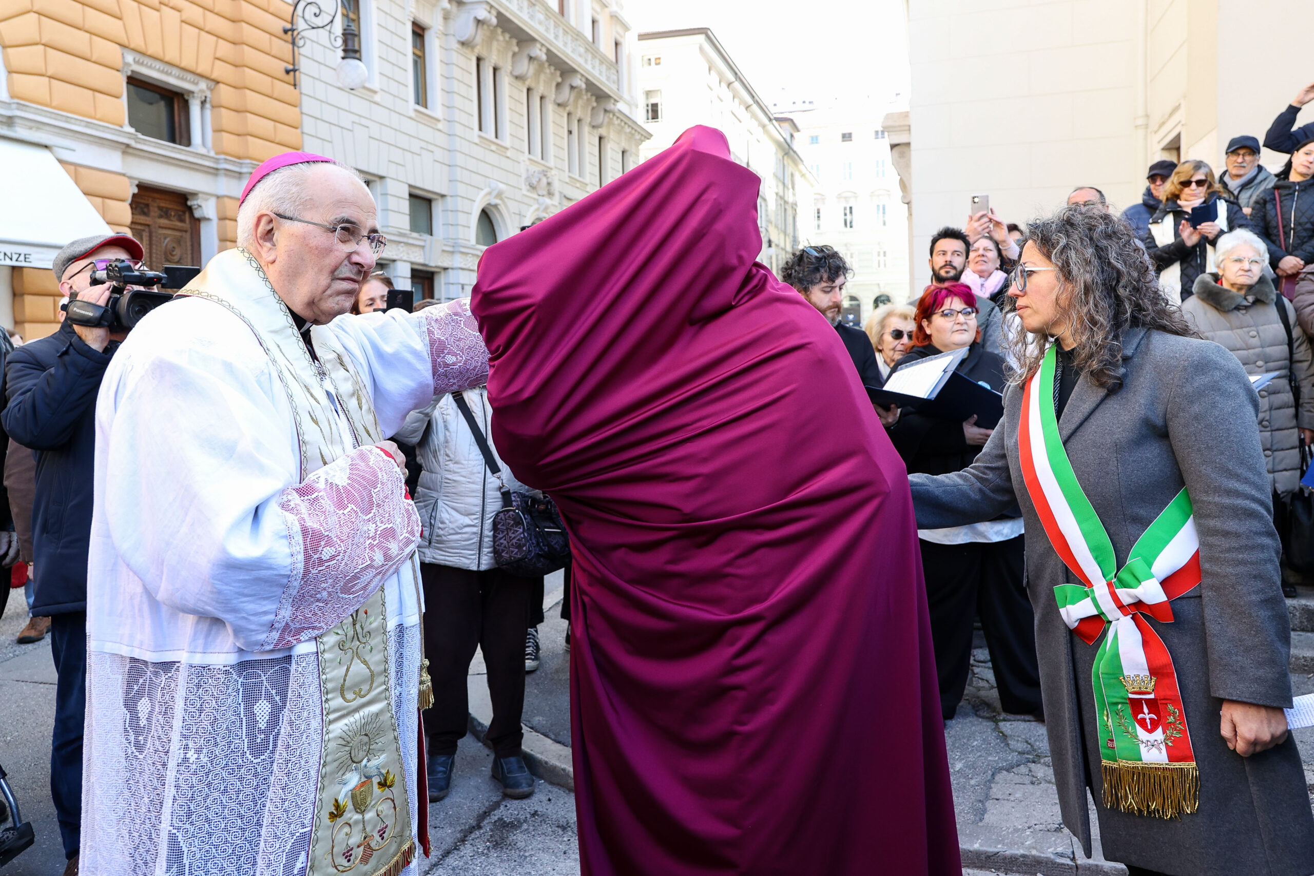 2. Con la benedizione della statua di questo mio illustre predecessore continua il giusto riconoscimento del valore che il vescovo Santin ebbe nella storia della Diocesi tergestina e della città di Trieste, opportunamente da tutti ricordato come Defensor civitatis. Ringrazio di cuore tutti quelli che hanno reso possibile questa opera meritoria: il benefattore il quale, con animo riconoscente verso monsignor Santin e autentico amore per Trieste, si è fatto carico di tutto il necessario per realizzarla; la Soprintendenza che ha seguito con accuratezza la progettazione; l’Amministrazione comunale di Trieste, che ha seguito con crescente e convinto coinvolgimento la realizzazione del progetto; il maestro Albano Poli del Progetto Arte Poli di Verona che ha realizzato la statua con autentica sensibilità artistica; l’architetto Eugenio Meli che ha coordinato tutta l’opera e la ditta Rosso costruzioni che ha provveduto alla collocazione in questa piazza. La statua che ritrae il vescovo Santin, senza piedestallo a significare la sua presenza non sopra noi ma tra di noi, è un monito salutare e profetico che, ricordandoci una pagina difficile del nostro passato, intende responsabilizzarci verso il presente e il futuro nel segno cristiano della pace e della giustizia.