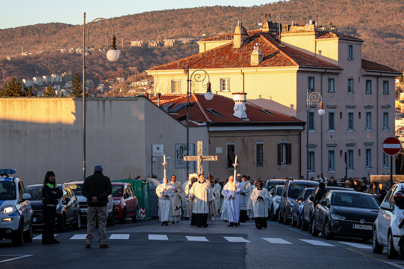Auguro a ciascuno un anno di ininterrotto pellegrinaggio interiore, in cui sempre ci rimettiamo dietro al Signore, con lo sguardo fisso su di Lui, Admirantes Jesum. E anche quando siamo stanchi impariamo a saperlo riconoscere al nostro fianco. E quando siamo caduti lui si fa Cireneo e ci rialza.