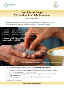Per ottenere o rinnovare il mandato di Ministri straordinari della Comunione, l’Ufficio Liturgico diocesano organizza, anche quest’anno, un ciclo di incontri formativi, che si terranno nel Seminario vescovile di via Besenghi 16, il sabato dalle ore 10 alle 12, secondo il seguente calendario: