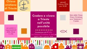 Giovedì 5 marzo 2026, alle ore 18.30, nella Sala della Comunità Greco Orientale (in Riva III Novembre, 7 – Il piano), si terrà l’iniziativa “Credere e vivere a Trieste nell’unità possibile” per la presentazione del «Patto tra Chiese Cristiane in Italia», siglato a Bari il 23 gennaio 2026. All’evento, organizzato dalle Chiese Cristiane di Trieste, parteciperanno i pastori e i rappresentanti delle chiese presenti in città.