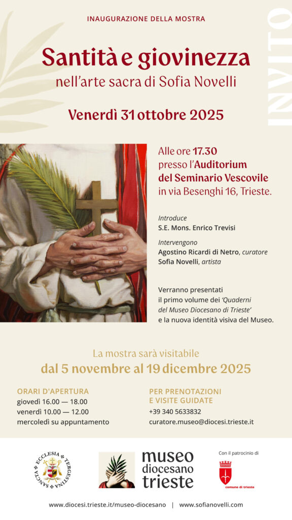 Successivamente negli spazi espositivi del Museo Diocesano di Trieste all’interno del Seminario Vescovile di via Besenghi 16, verrà inaugurata la mostra Santità e giovinezza nell’arte sacra di Sofia Novelli.