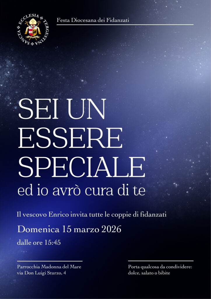 Domenica 15 marzo 2026, alle ore 15.45, presso la parrocchia della Madonna del Mare (ingresso da via don Sturzo, 4) , il Vescovo mons. Enrico Trevisi partecipa all’incontro diocesano dei fidanzati: “Sei un essere speciale, ed io avrò cura di te”, organizzato dalla Commissione Diocesana per la Famiglia.