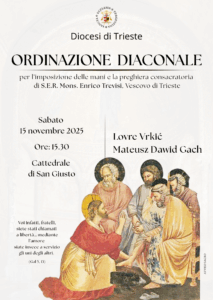 Sabato 15 novembre 2025, alle ore 15.30, nella Cattedrale di San Giusto, il Vescovo mons. Enrico Trevisi presiede la Santa Messa e conferisce l’ordine del diaconato ai seminaristi Lovre Vrkić e Mateusz Dawid Gach.