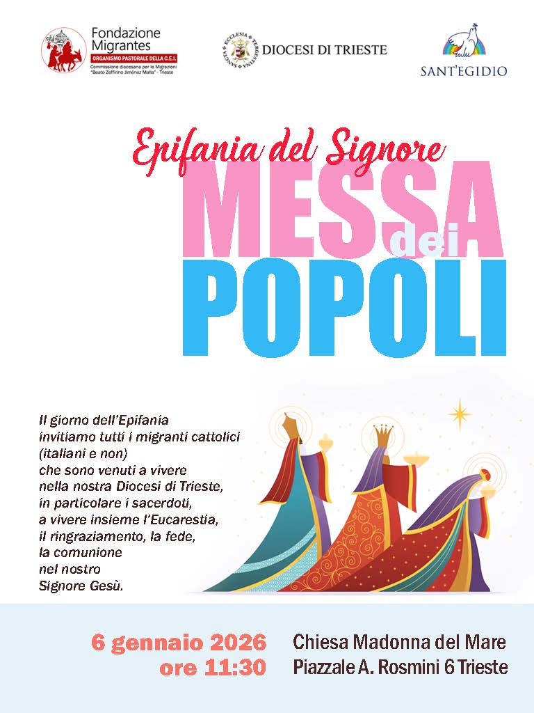 La Fondazione Migrantes della Diocesi di Trieste, assieme alla Comunità di Sant’Egidio, invita tutti i migranti cattolici (italiani e non) che sono venuti a vivere nella nostra Diocesi. In particolare i sacerdoti, per celebrare insieme l’Eucaristia, il ringraziamento, la fede, la comunione nel nostro Signore Gesù.
