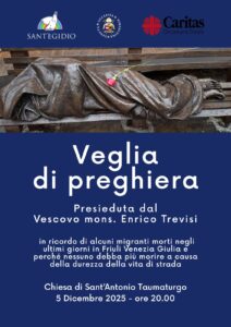 Accogliendo la proposta della Comunità di Sant’Egidio, il Vescovo di Trieste, mons. Enrico Trevisi, e la Caritas diocesana invitano la comunità credente e la cittadinanza alla veglia di preghiera che si terrà domani, venerdì 5 dicembre, alle ore 20 a Trieste, nella chiesa di Sant’Antonio Taumaturgo, per ricordare il giovane di origine algerina rinvenuto senza vita in Porto Vecchio e i tre giovani migranti recentemente trovati morti sul territorio regionale.
